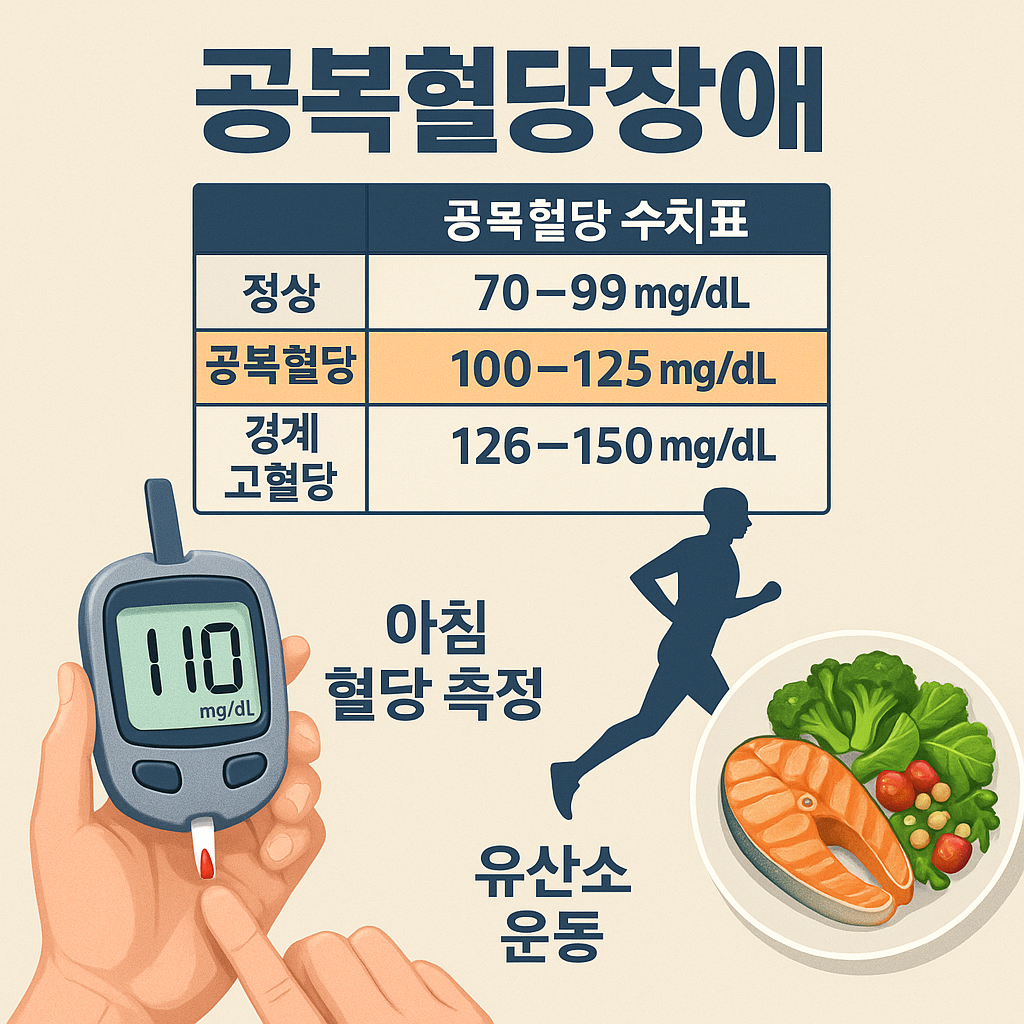 | 공복혈당장애 | 100 ~ 125 | 당뇨 전단계 (인슐린 저항성 시작) | 식습관·운동 교정 필요 |
