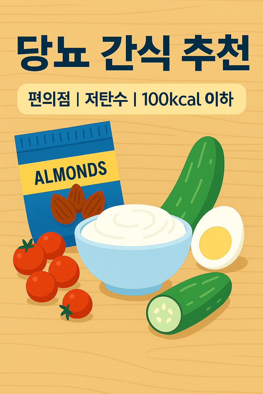 - 삶은 달걀 (1개, 약 70kcal) 단백질 함량이 높고 탄수화물이 거의 없어 혈당 상승 위험이 적습니다. 편의점 냉장 코너에서 쉽게 구매할 수 있으며 소금 대신 후추나 파프리카 가루를 곁들이면 맛도 개선됩니다.